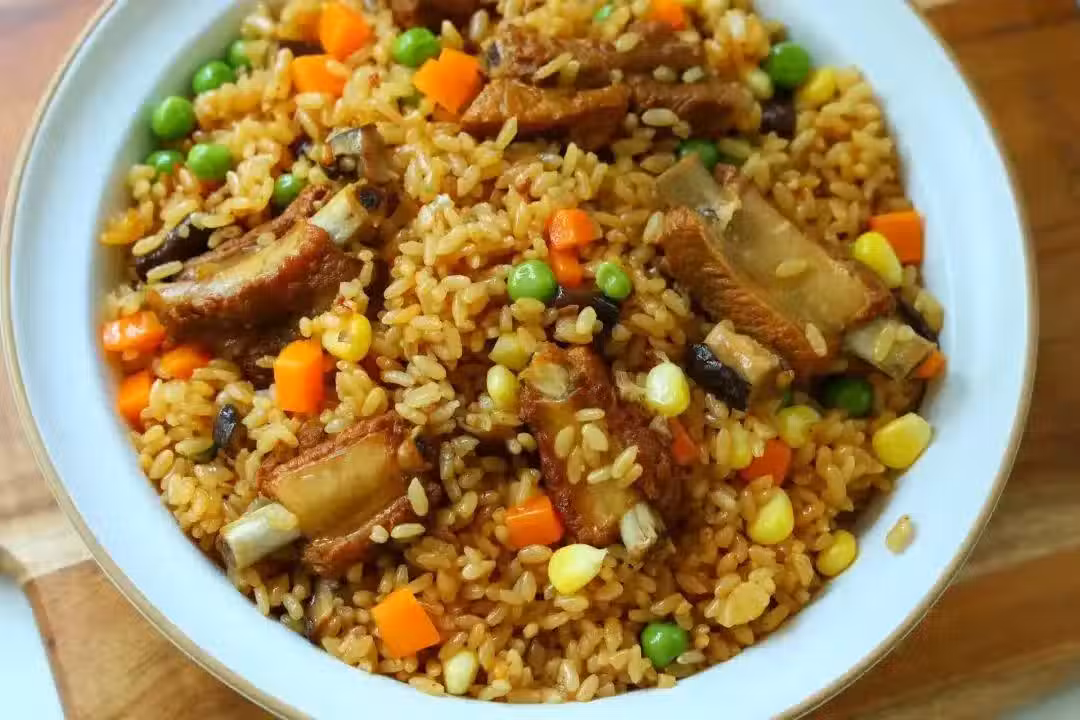 製作配料:排骨500克 大米3杯 冰糖適量 鹽1勺半 生抽2勺 老抽1勺 白鬍椒粉+姜粉1小勺 干香菇1把 豌豆200克+胡蘿蔔半根+玉米半根