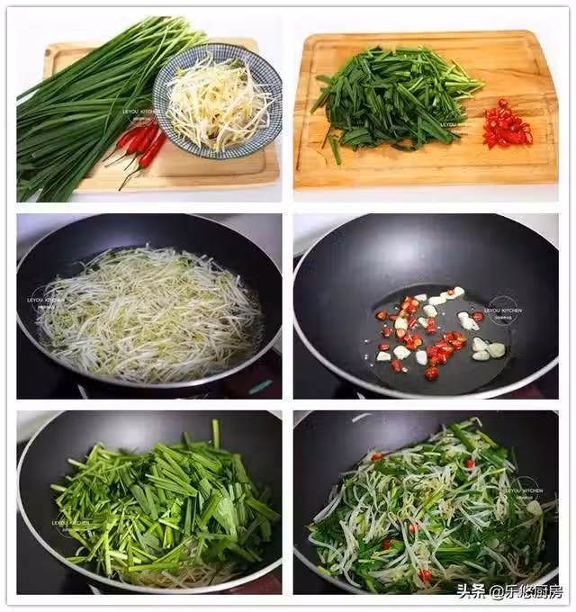 第五步:把綠豆芽、韭菜放入鍋中,轉大火快速翻炒均勻。
