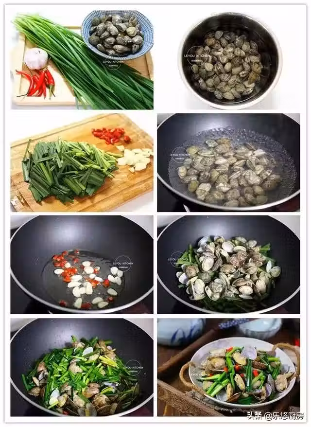 2、花蛤焯水後基本上已經熟了,而韭菜也是易熟蔬菜。所以,當這種兩食材放入鍋中炒時,一定不要炒太長的時間。大火翻炒均勻,調下味就可以出鍋。炒太久,容易使韭菜出湯,影響整道菜的口感。
