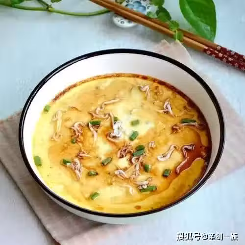 3、鱈魚雞蛋羹蒸好後,撒上蔥花和白芝麻,淋入醬油,澆上熱油激發出香味即可端上桌開吃。