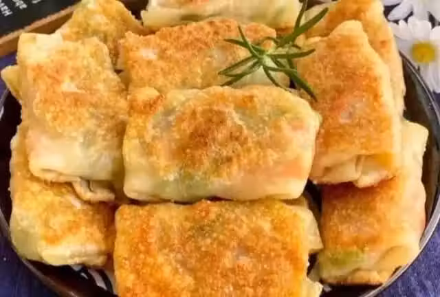 3、餃子皮擀薄,放入土豆絲,兩邊對摺,上下對摺,全部折好後,油熱下鍋,煎至兩面金黃即可。