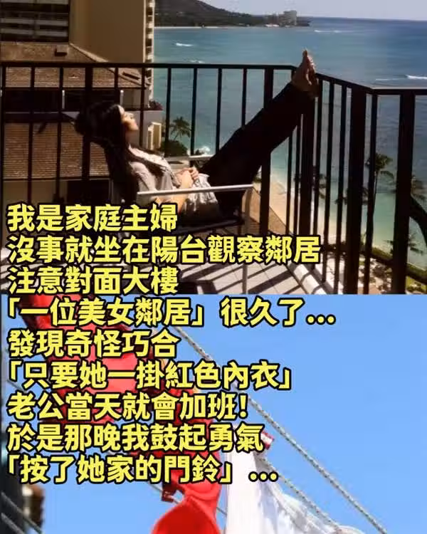 我是家庭主婦,沒事就坐在陽台觀察鄰居,注意對面大樓「一位美女鄰居」很久了...發現奇怪巧合「只要她一掛紅色內衣」老公當天就會加班! 於是那晚我鼓起勇氣「按了她家的門鈴」...