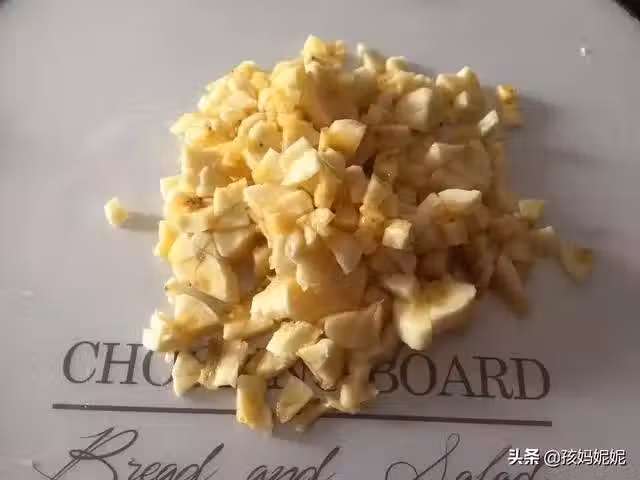 1、香蕉去皮切成細小的丁,香蕉丁不能切得太大了,還要和酸奶和藍莓醬拌,也是要根據自己家裡買的餛飩皮的大小來決定的,能夠完全的把香蕉包裹成糖果的形狀就可以了。