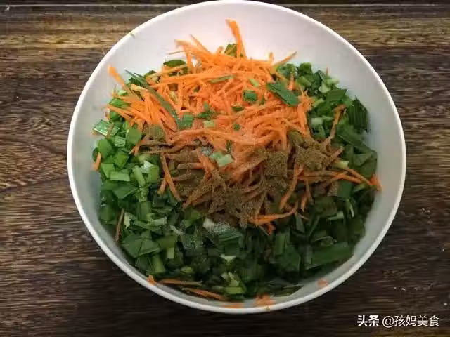 3、兩種食材放入碗中加鹽、五香粉拌勻靜止5分鐘殺水,蔬菜遇到鹽會出湯,在後期拌麵粉的時候好操作。