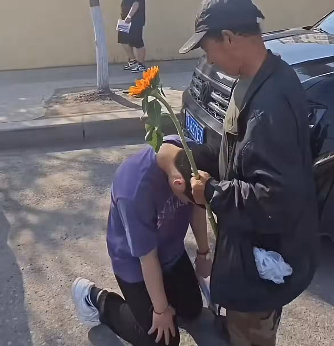 父親趕緊拉起兒子,把手裡的向日葵遞給對方,還是沒說什麼,被兒子一把攬在懷裡,那一刻,真的讓人動容。