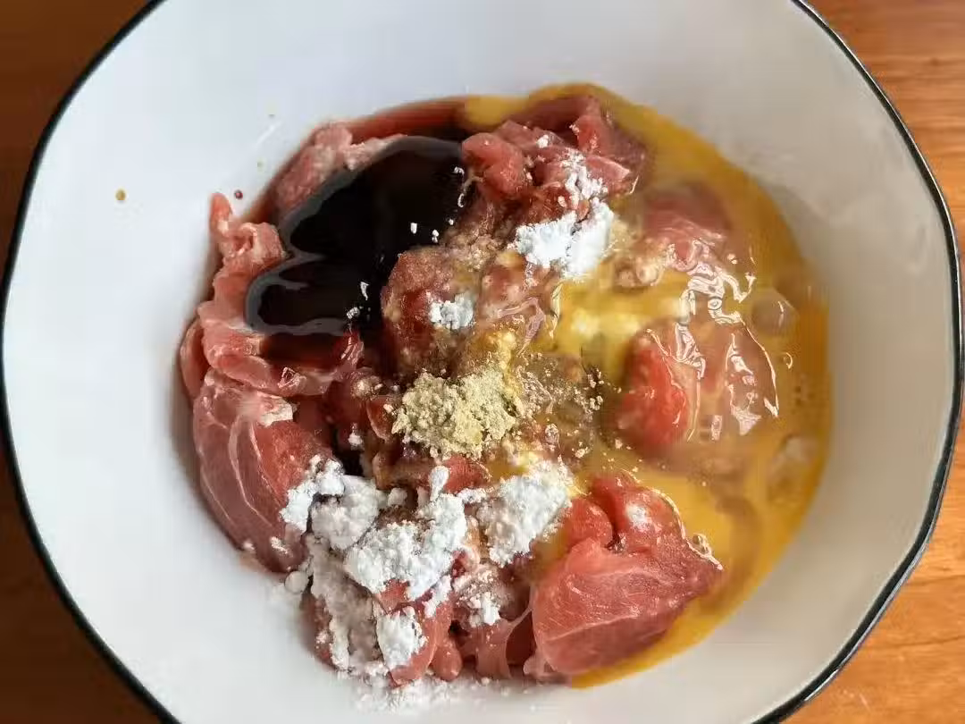 6、把拌好的米粉直接倒在牛肉碗里,讓每一片牛肉均勻裹上一層米粉。