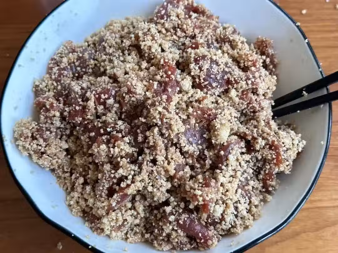 7、均勻鋪在碗中。碗底可以墊一點紅薯塊之類的;入鍋之前表面再噴點清水。
