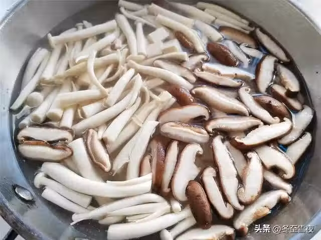4.鍋內加入水燒開,下入海鮮菇,香菇和豆腐焯水,水開後,煮1分鐘,把這三種食材一起撈出,瀝凈水分待用,蘑菇焯水,可以去除蘑菇不好的味道,使蘑菇的味道更純正,豆腐焯水,可以去除豆腥味。