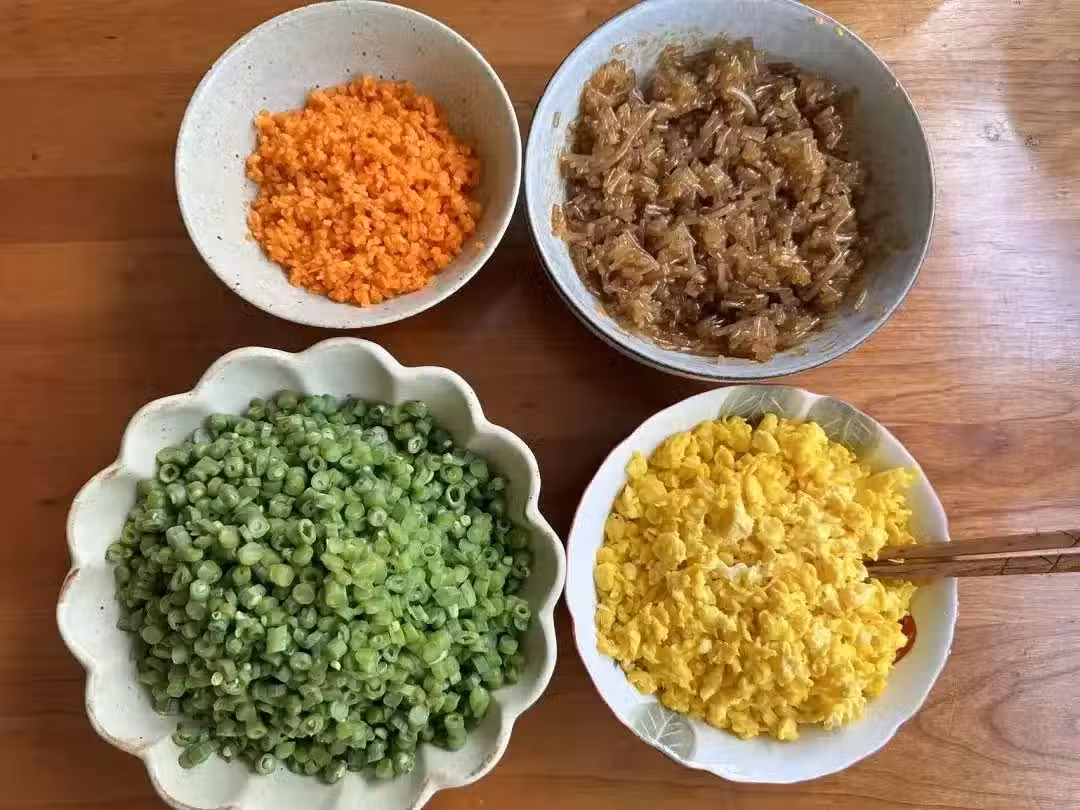 2、當所有食材準備就緒後,我們將其全部放入一個大盆中。接著,加入適量的五香粉、蚝油、鹽和香油或豬油。這些調料的加入不僅提升了餡料的口感,還使其更加美味可口。用勺子或手輕輕攪拌,使所有食材和調料充分融合。