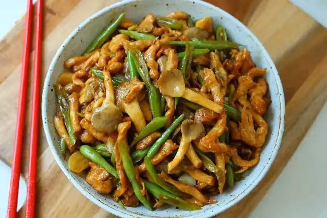 製作配料:雞胸肉1塊 豆角1把 蘑菇1盒 生抽2勺 老抽1勺半 鹽1勺半 澱粉1勺 白鬍椒粉+姜粉1勺小勺 蚝油1勺 大蒜2個