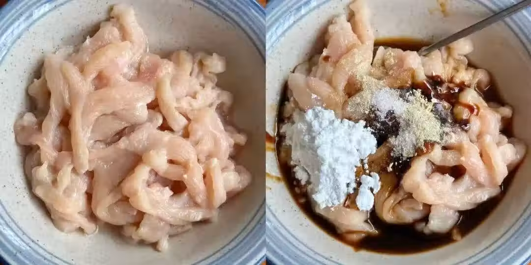 2、在腌好的雞胸肉絲上,淋上少許食用油,輕輕攪拌幾下,這樣做可以鎖住肉絲中的水分,使其炒制時更加鮮嫩多汁。然後,將腌制好的雞胸肉絲放入密封容器中,放入冰箱冷藏腌制2小時左右。冷藏的過程不僅能讓肉絲更加入味,還能讓肉質更加緊實。