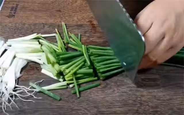 2.帶根的小香蔥用刀拍幾下,在炸制的時候更容易炸透,切成3到4厘米長的段,放入盆中備用。