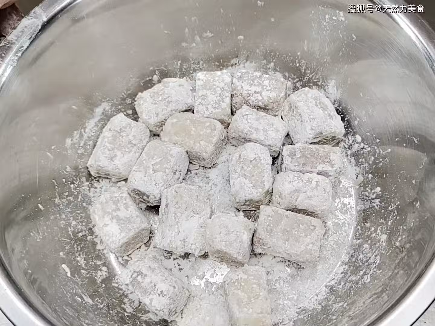 12、起鍋加油,大火把油溫加熱到180度左右,接著把裹好澱粉的香芋倒入鍋內。香芋下鍋後先不要去動,稍微等上15秒後改中火,這時油溫基本可以穩定在一個高溫的度數。等香芋外表定型後再輕輕地推動,把相互粘在一起的香芋敲開。