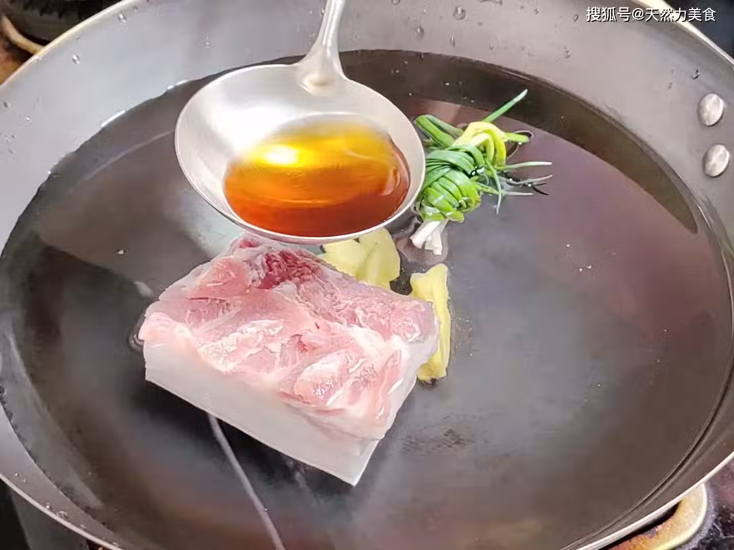 10、全程保持大火,待鍋中的水沸騰後計時30分鐘。一直把五花肉煮到用筷子能輕易把五花肉插透就說明可以了,先把五花肉撈出,再用清水清洗一下,把表面的浮沫和雜質洗乾淨。
