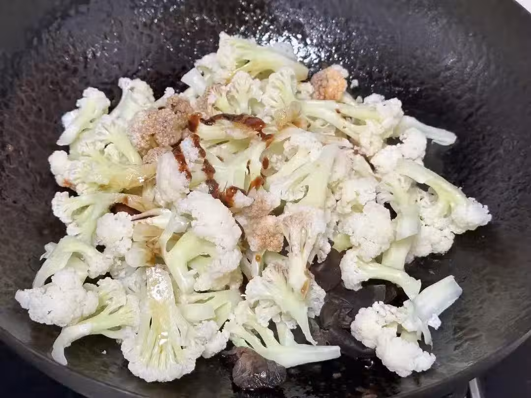 5、當花菜炒至斷生、木耳變得柔軟時,撒上切好的蔥段。繼續大火翻炒,讓蔥段的香氣與之前的味道完美融合。此時,你可以聞到一股令人垂涎的香氣,這正是「番茄炒花菜」的魅力所在。(花菜焯水基本已經熟了,不需要翻炒時間太久,不然影響口感)