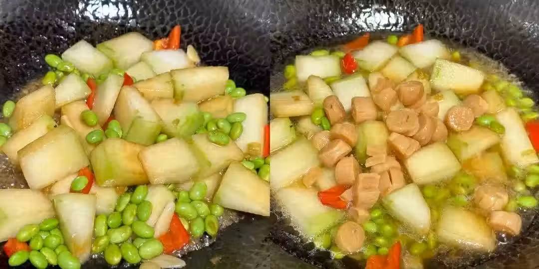 4、當食材全部熟透後,打開鍋蓋,大火收汁。此時,可以加入一些水澱粉勾芡,讓湯汁更加濃稠。最後,再次翻炒幾下,讓湯汁均勻地裹在食材上。此時,一道色香味俱佳的乾貝冬瓜毛豆燜煮就完成了。