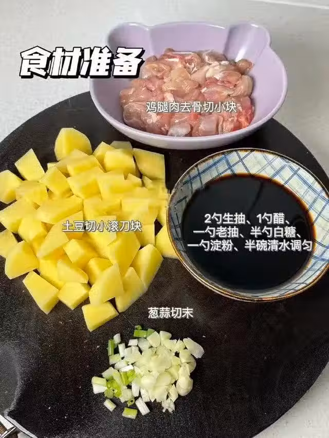 1、土豆去皮切塊,雞腿肉去骨切塊,大蒜切末,小蔥頭洗凈切成蔥花;雞腿肉放料酒,生抽抓勻腌制半小時左右。