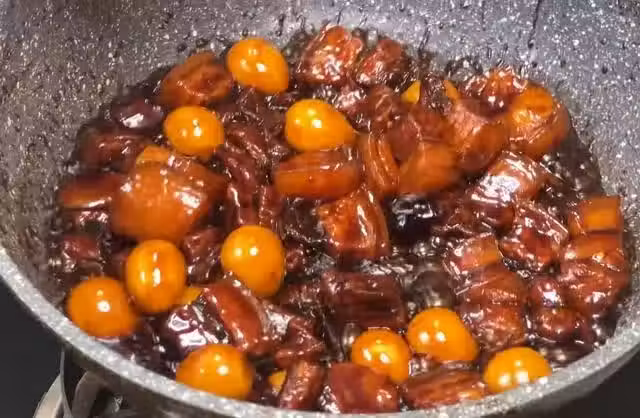 5、煮至40分鐘左右後,揭開鍋蓋,加入已煮熟去皮的鵪鶉蛋進行翻炒,用大火直到把汁收干,就可以出鍋啦,再撒上蔥花,簡直是色香味俱全,這美滋滋的紅燒肉可以開吃了,趁熱吃才好吃。
