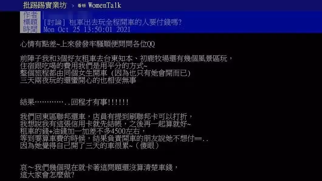 貼文曝光後,馬上吸引眾多網友討論,多數人都認為唯一會開車的朋友不用負擔車子相關費用很合理,因為全程開車真的很累人,其中有網友點出關鍵,「4500元3個人平分,1個人也才付1500,而且更重要的是,只有1個會開車,如果她沒參加妳們根本無法成行」,此外也有人認為原PO抱怨的態度才有問題,忍不住痛批:「妳朋友有夠可憐,妳們3個根本是損友,把她當成免費司機嗎?」