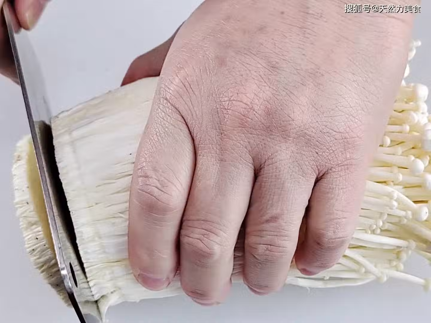 2、接著把金針菇撕成手指大小的小塊,撕的時候不要撕太大塊,因為太大塊就不容易炸透,也不好掌握炸制的時間和火候。