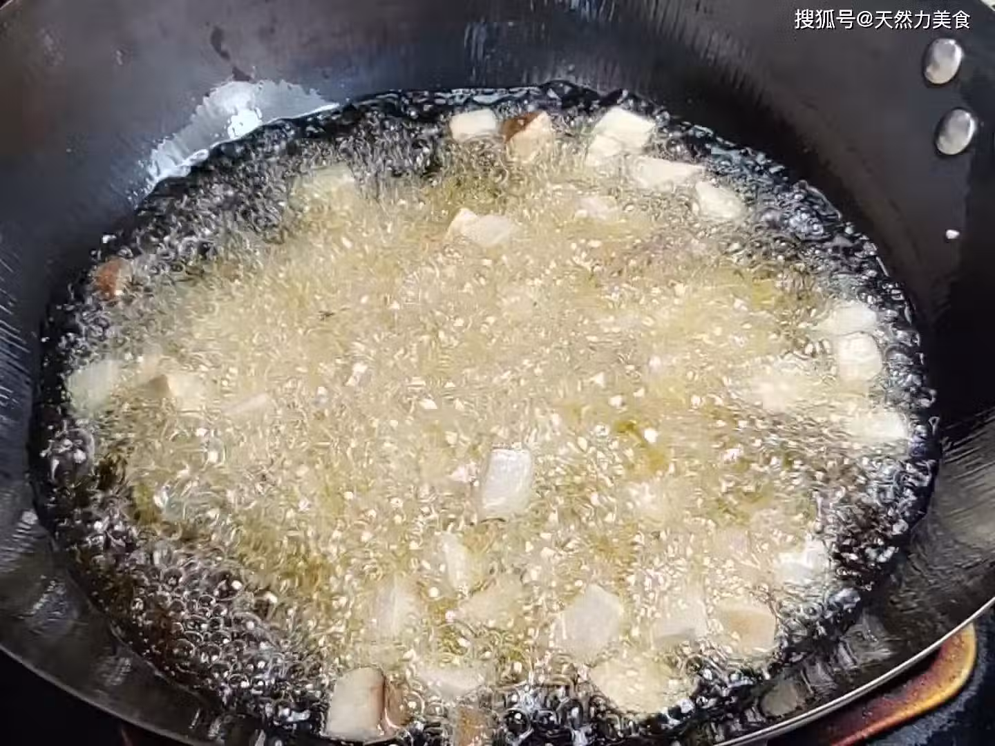 2、我們要一直把杏鮑菇炸到表面有些金黃就可以倒出控油,整個過程大概炸了3分鐘左右的時間。如果不想過油的話也可以用少量的油來煎一下,另外杏鮑菇在過油的時候基本上是不怎麼吸油的。