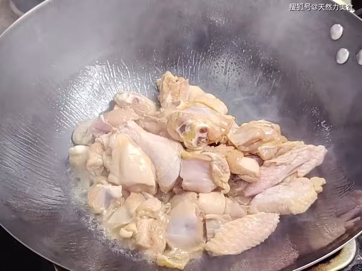 2、雞肉下鍋後把雞肉攤開,讓雞肉均勻受熱,我們在煎雞肉的時候可以用大火來煎,這樣可以讓雞肉的外錶快速定型,就可以快速地鎖住雞肉中的水分不流失。