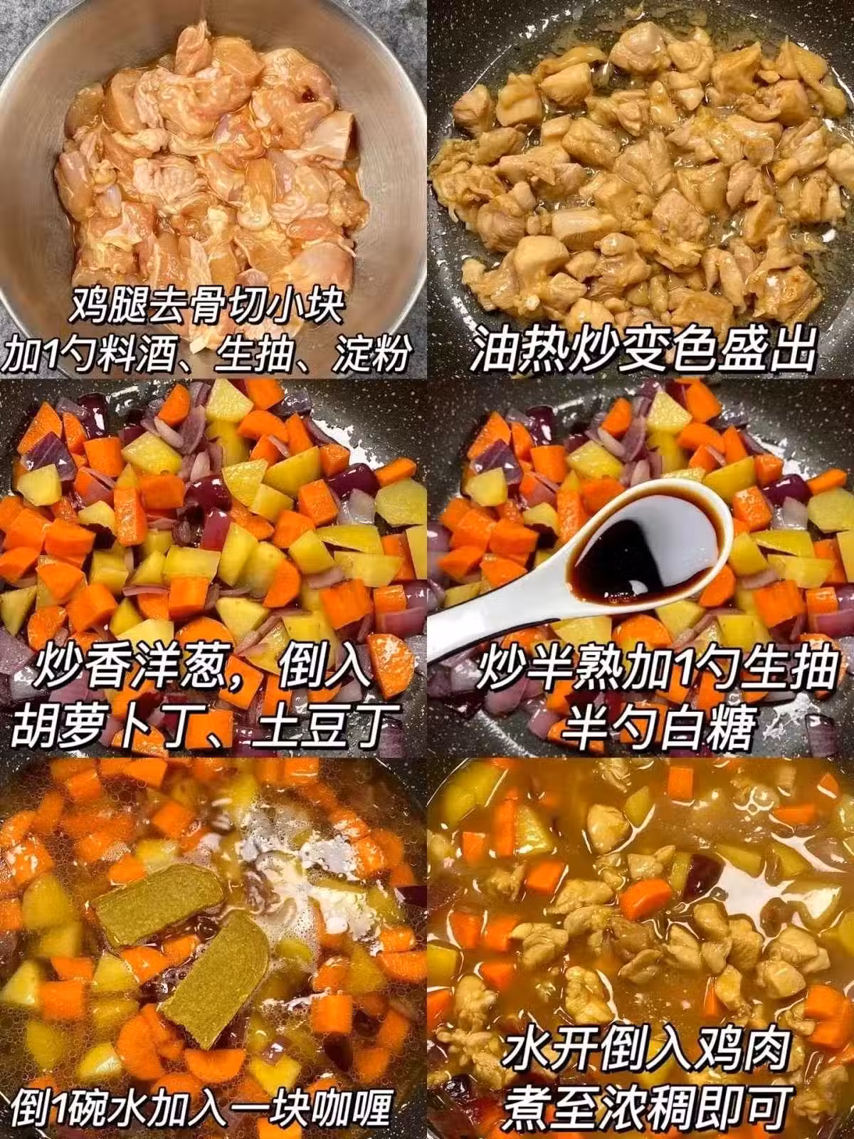 2⃣️胡蘿蔔、土豆、洋蔥洗凈切丁,油熱倒入雞肉炒變色盛出