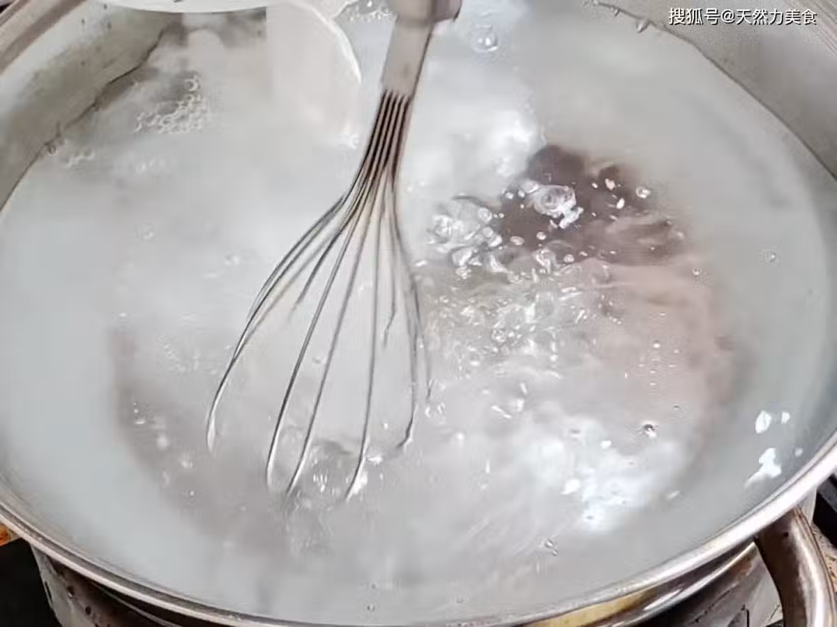 4、所有的豌豆澱粉都下鍋後,也要不停地繼續攪拌,一直煮到豌豆澱粉呈現濃稠透明的狀態,並且起大泡的時候就可以關火。