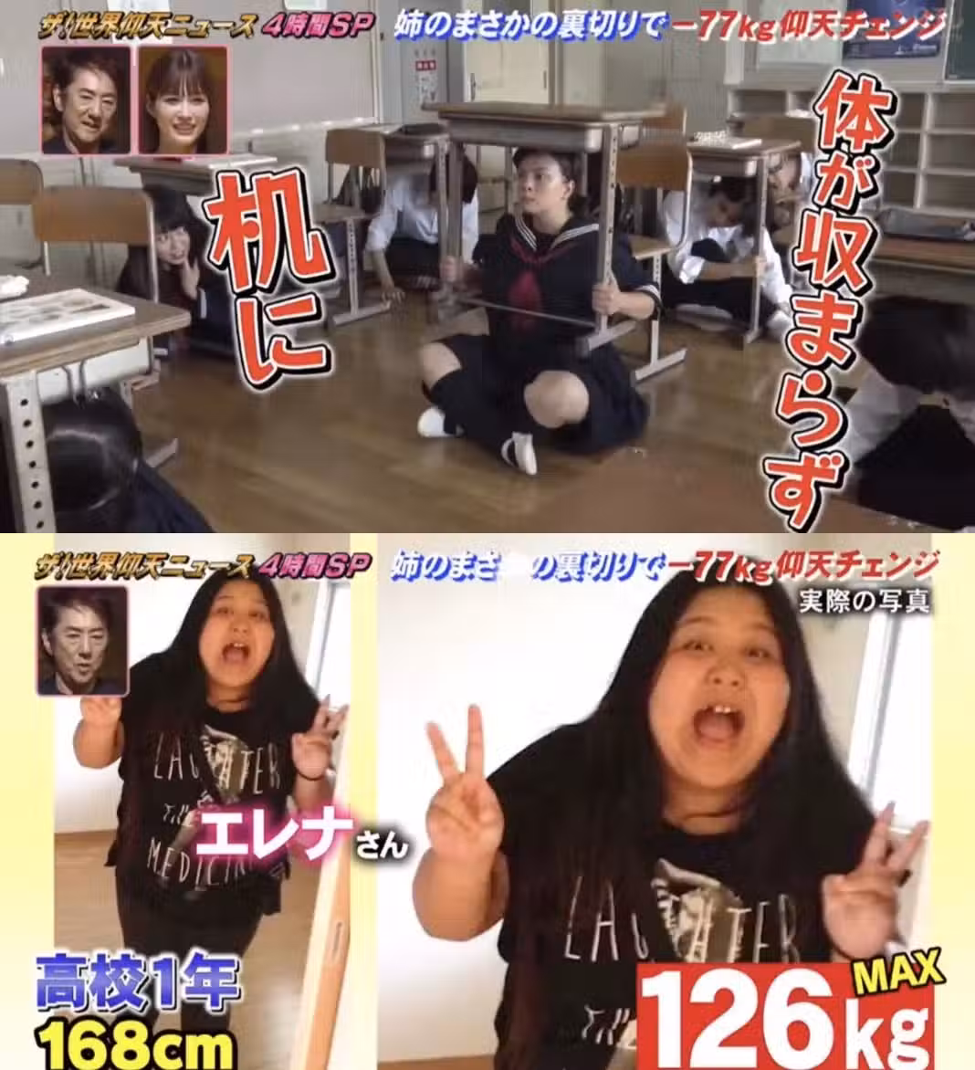 エレナ到了高中的時候,體重來到了最高巔峰值168kg,姐姐體重也到了95kg。由於笨重的身體導致行動緩慢,在學校里遇到了很多不便,比如說預防地震訓練,就沒辦法完全塞進桌子下。