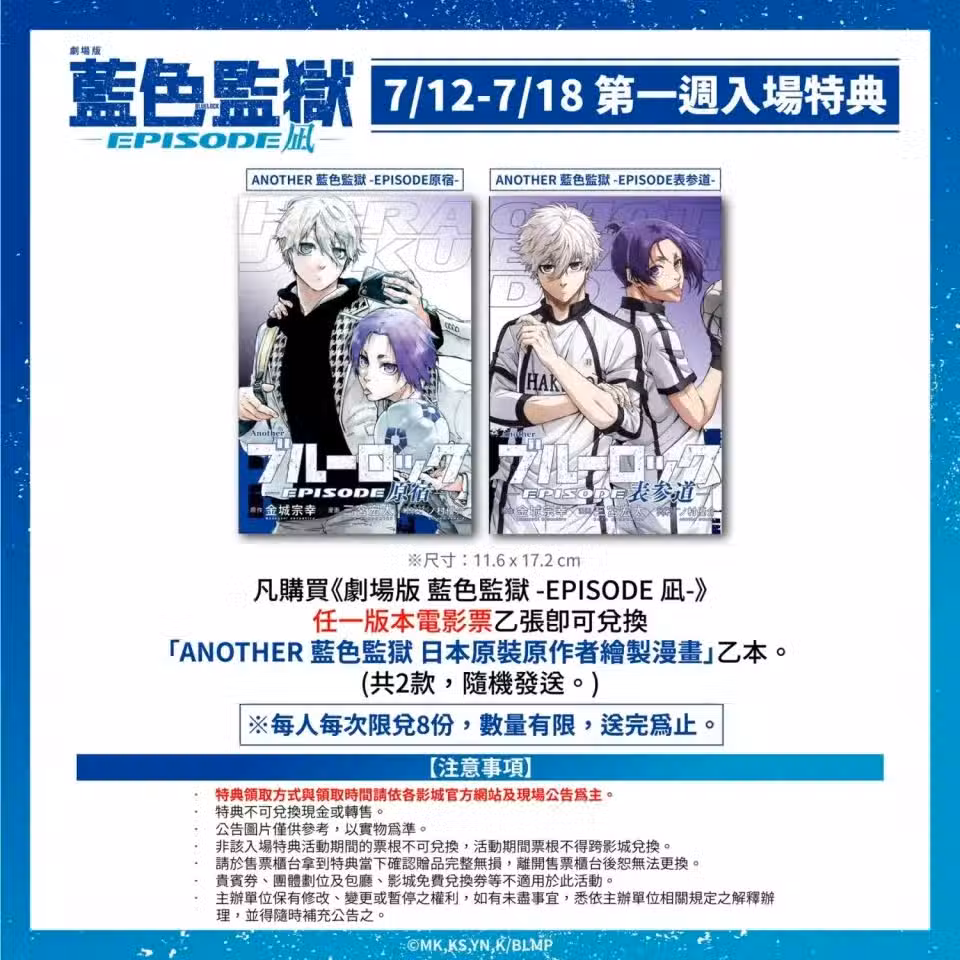 《藍色監獄》7月12日至18日將送出《ANOTHER ブル-ロック -EPISODE 原宿-》與《ANOTHER ブル-ロック -EPISODE表參道》,兩本內容完全不相同的日語原裝漫畫,內容是由原作家金城宗幸、漫畫家三宮宏太以及野村優介三人共同推出,凡購買本作任一版本電影票乙張即可於戲院售票櫃檯兌換上述特典。