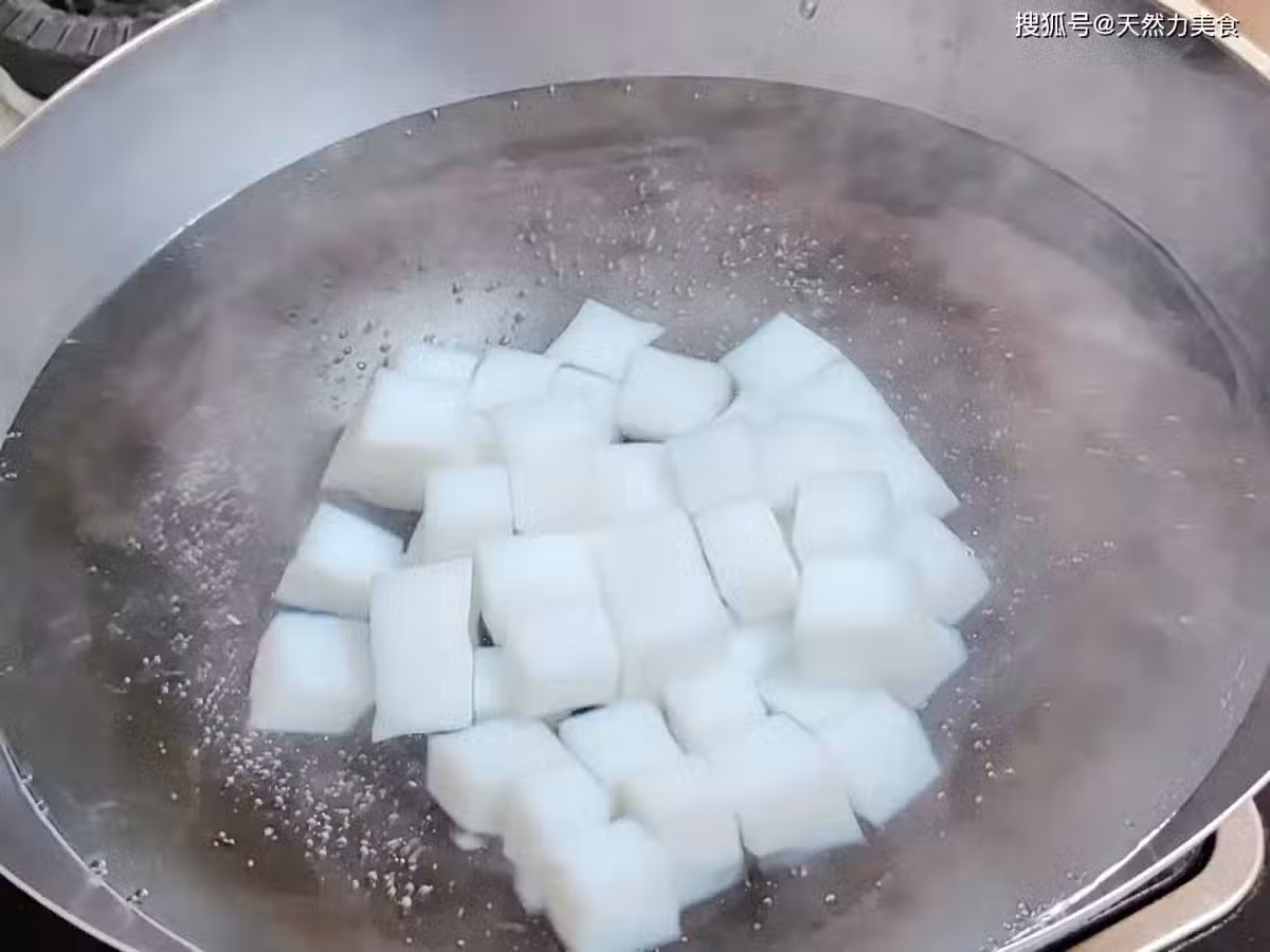 2、涼粉下鍋後保持大火,等等鍋中的水再次沸騰後計時30秒就把涼粉撈出,然後倒進準備好的冷水中過涼,過涼後倒出控水備用,這樣的涼粉在後期煸炒的過程中就更不會炒爛。