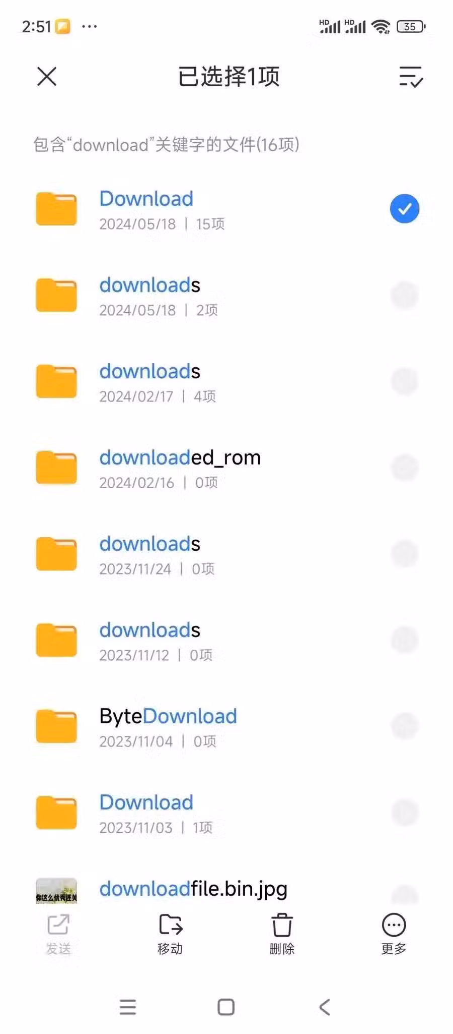 然後長按這個文件,再點擊右上角的三條槓全選,再點擊手機最底部的四個選項里的刪除,