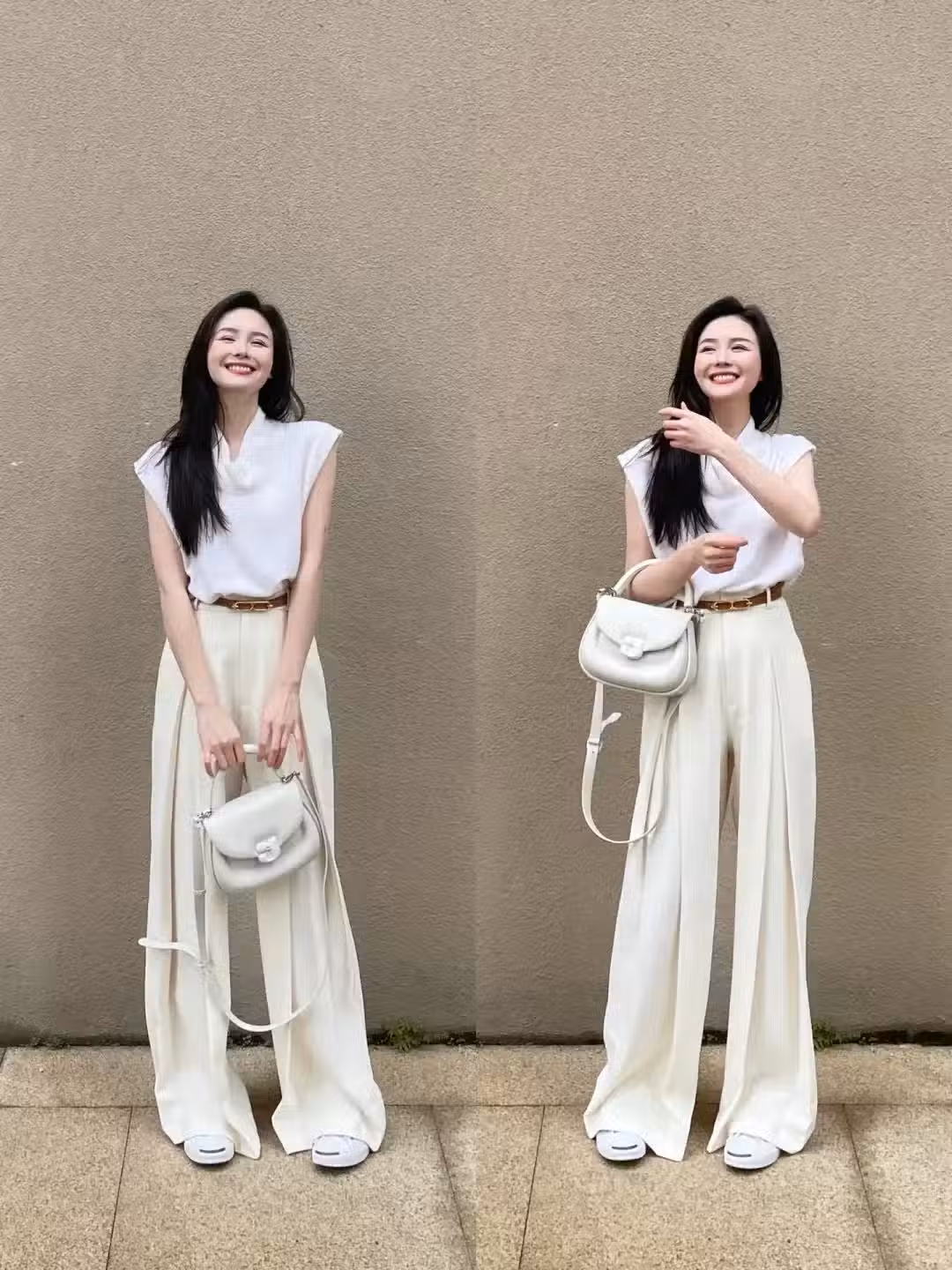 單品解析:白色T恤,作為衣櫥中的基礎單品,其百搭性不言而喻。選擇一件質地優良、版型合身的白色T恤,能夠瞬間提升整體造型的質感。搭配一條高腰設計的闊腿褲,不僅能夠拉長腿部線條,顯得身材更加修長,還能營造出一種隨性而不失格調的氛圍。