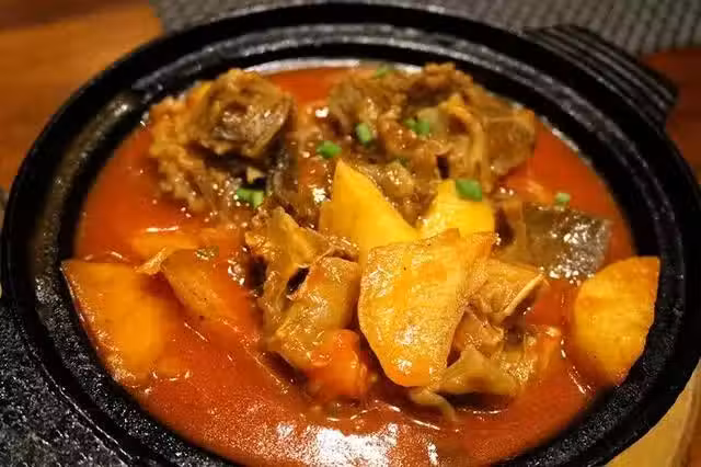 出鍋前撒白鬍椒粉,改大火煮沸2分鐘,至肉爛汁濃即可。上桌時可以點綴香蔥或香菜、青蒜等。