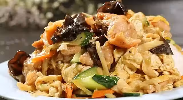 炒鍋上火,加油燒熱,將肉絲放入煸炒,肉色變白後,加入蔥、薑絲同炒,至八成熟時,加入料酒、醬油、鹽,炒勻後加入木耳、黃瓜、胡蘿蔔和雞蛋塊同炒,成 熟後淋入香油即可。