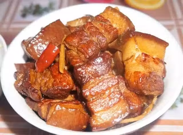 材料:五花肉500克、蔥1/4段、姜4片、草果1顆、八角2顆、花椒1小匙、紅辣椒2顆、