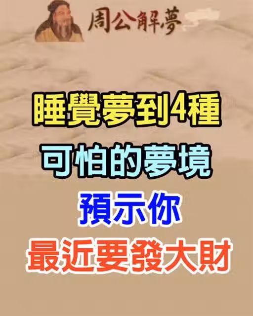 周公解夢是中華的傳統瑰寶,類似現代人所說的夢境心理學, 它是通過對夢境的解析來預測當下人類的心理活動, 並由此來判斷接下來的一系列行動會產生的後續影響。 夢是人在睡覺時產生的一種虛幻的境界, 反應出你最近的身體和心理的狀態。 今天我們就來說一些比較可怕的夢,如果你最近有做這幾種夢, 不要有過多的擔憂和恐懼,因為現實與夢境相反, 有望升官發財。到底是哪些夢呢?大家一起來看看吧!