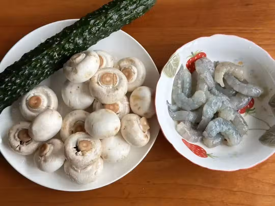 2、口蘑切厚片、青瓜去皮去瓤切菱形塊、胡蘿蔔切菱形片、大蒜切片備用。