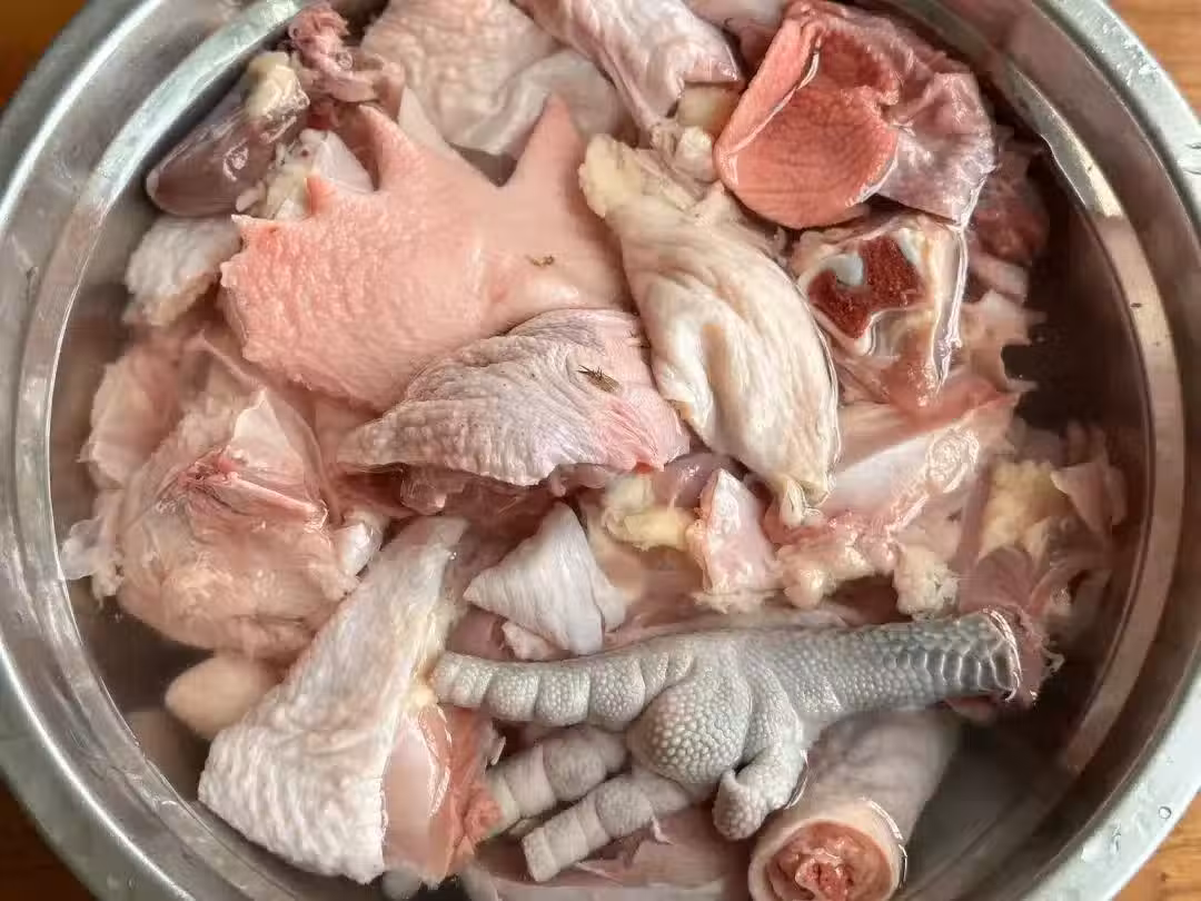 2、雞肉冷水下鍋,加入蔥姜料酒焯水2-3分鐘,撈出來瀝干水分備用;冷油冷鍋,加入冰糖炒出糖色,加入雞肉翻炒至上色。