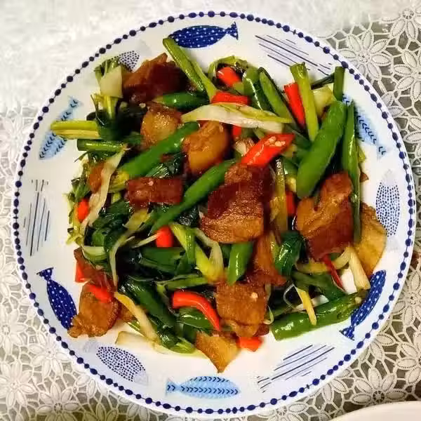 用料: 五花肉 適量、蒜苗 10顆、小紅椒 2顆、小青椒 3顆、紹豐和豆瓣醬 1湯匙(20克)、辣椒油 半湯匙(10克)、蔥姜蒜 適量;