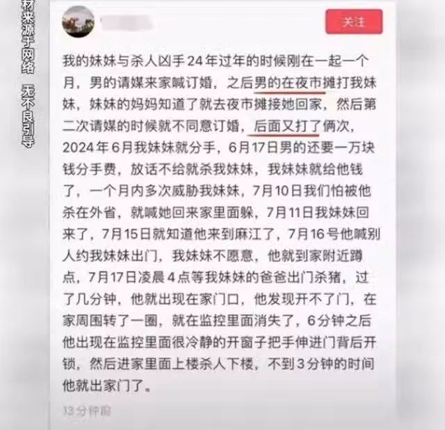 本月19日,該名聲稱是女子家屬的網友指出,女子日前被宋男闖入屋內殺害,「半夜4點入室殺人,一共捅了16刀」。