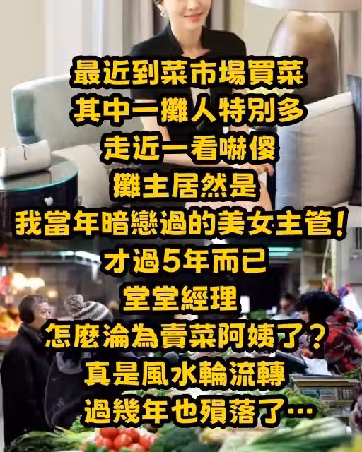 最近到菜市場買菜,其中一攤人特別多,走近一看嚇傻,攤主居然是我當年暗戀過的美女主管!才過5年而已,堂堂經理怎麼淪為賣菜阿姨了?真是風水輪流轉,過幾年也殞落了…