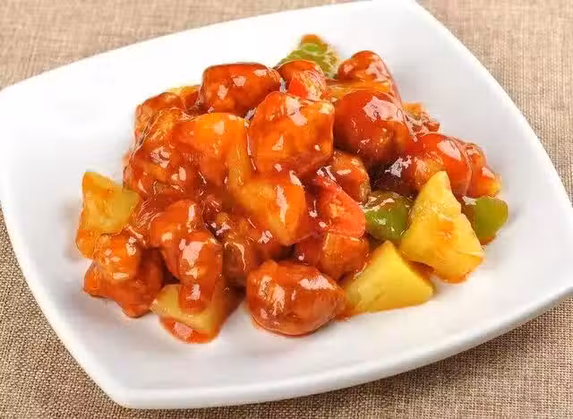 3、留油少許,投入蔥蒜,辣椒爆出香味加蔥,番茄醬燒至微沸,用濕澱粉調稀勾芡,隨即倒入肉塊和筍塊拌炒,搓淋入麻油和花生油炒勻即可。