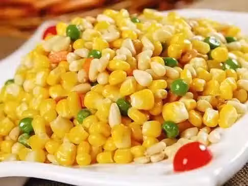玉米:適量;荷蘭豆: 適量; 胡蘿蔔: 適量;松子仁: 適量;植物油:少許;食鹽:適量;蔥:適量; 雞精:適量;