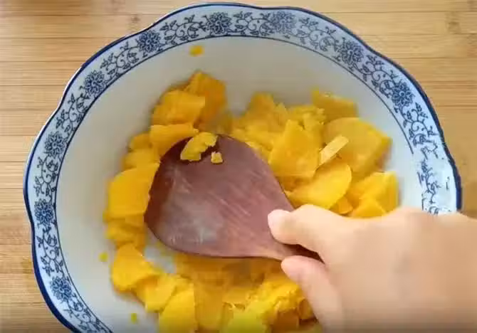 2.接下來我們把紅薯去皮切成薄片,上鍋蒸十分鐘,然後把它按壓成細膩的紅薯泥,喜歡吃甜的可以加一些白糖。