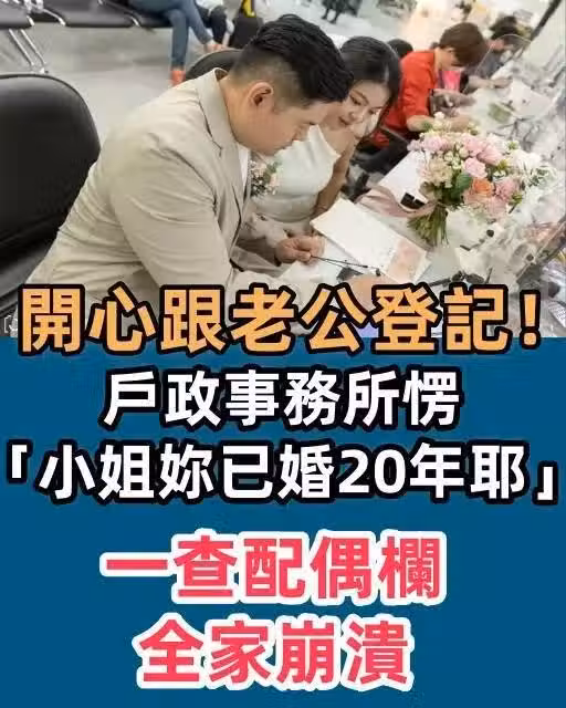 最近有位女子原本興高采烈、準備和另一半到戶政單位領證結婚,但當天一查才發現…自己不僅已結婚長達二十年,配偶欄名字更是自己的親妹夫!