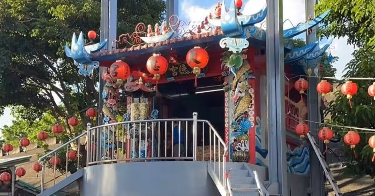 天德宮副主委 呂先生說,「(繩索)同步拉起來它才會平衡,(再把它拉上去)給它卷上去,這樣就升上去了,(它在動了嗎)對。」