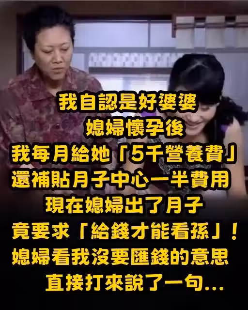 我自認是好婆婆,媳婦懷孕後,我每月給她「5千營養費」、還補貼月子中心一半費用,現在媳婦出月子,竟要求「給錢才能看孫」!媳婦看我沒要匯錢的意思,直接打來說了一句...