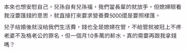 她安慰自己,兒孫自有兒孫福,當長輩的就該放手,但媳婦看她沒打算匯錢,直接打電話要求「5000還是要照樣匯!」她不禁疑惑,兒子每月收入10幾萬,婚後就沒給兩老生活費,錢也都是媳婦管,真的有需要再跟她拿錢嗎...
