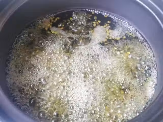 2、綠豆煮至沸騰關火,用冷水快速沖涼。